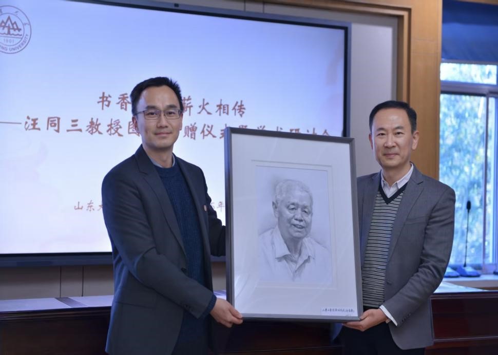 接受捐赠,并回赠山大学子精心绘制的汪同三教授肖像画。经济a片无码